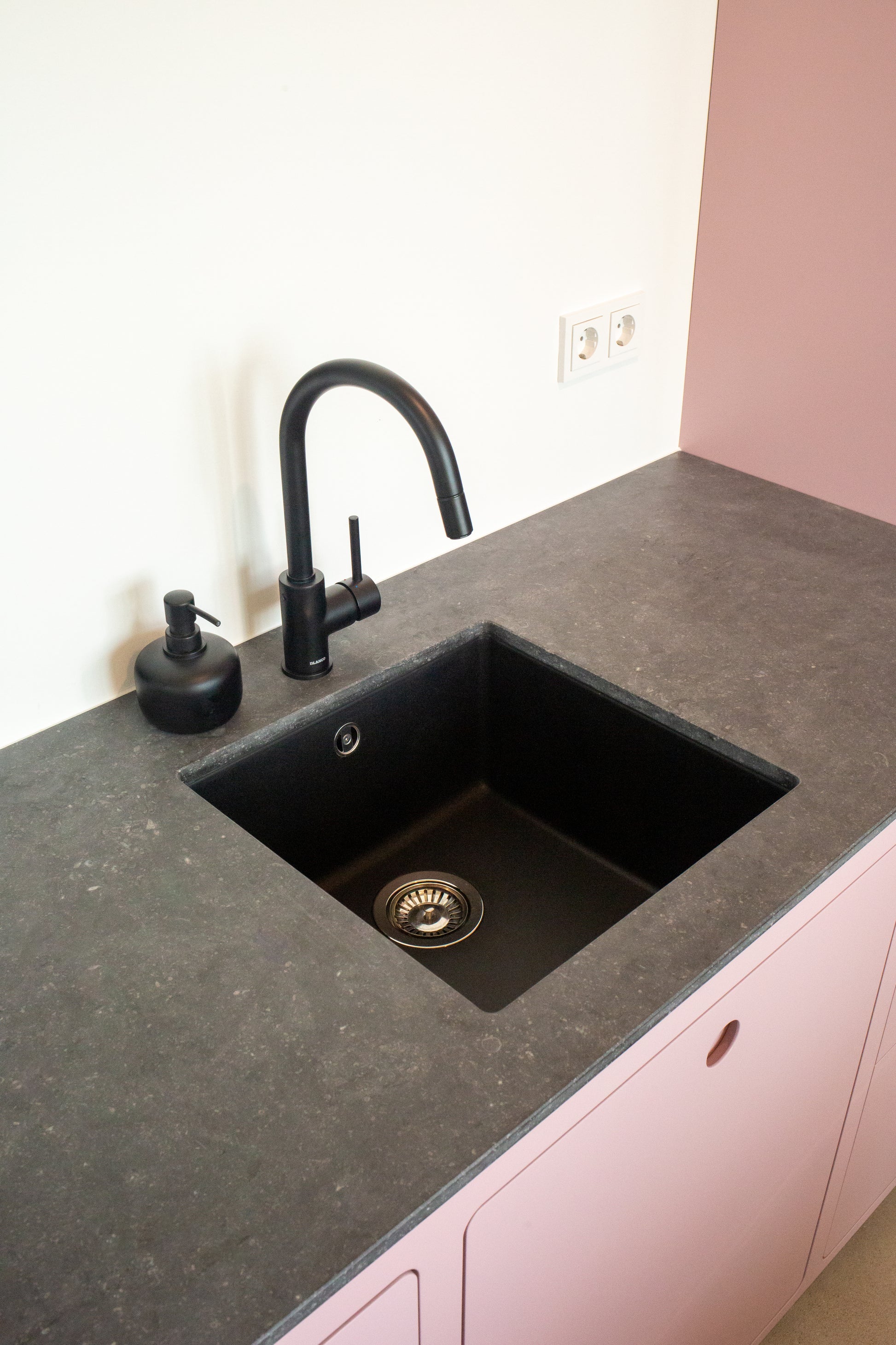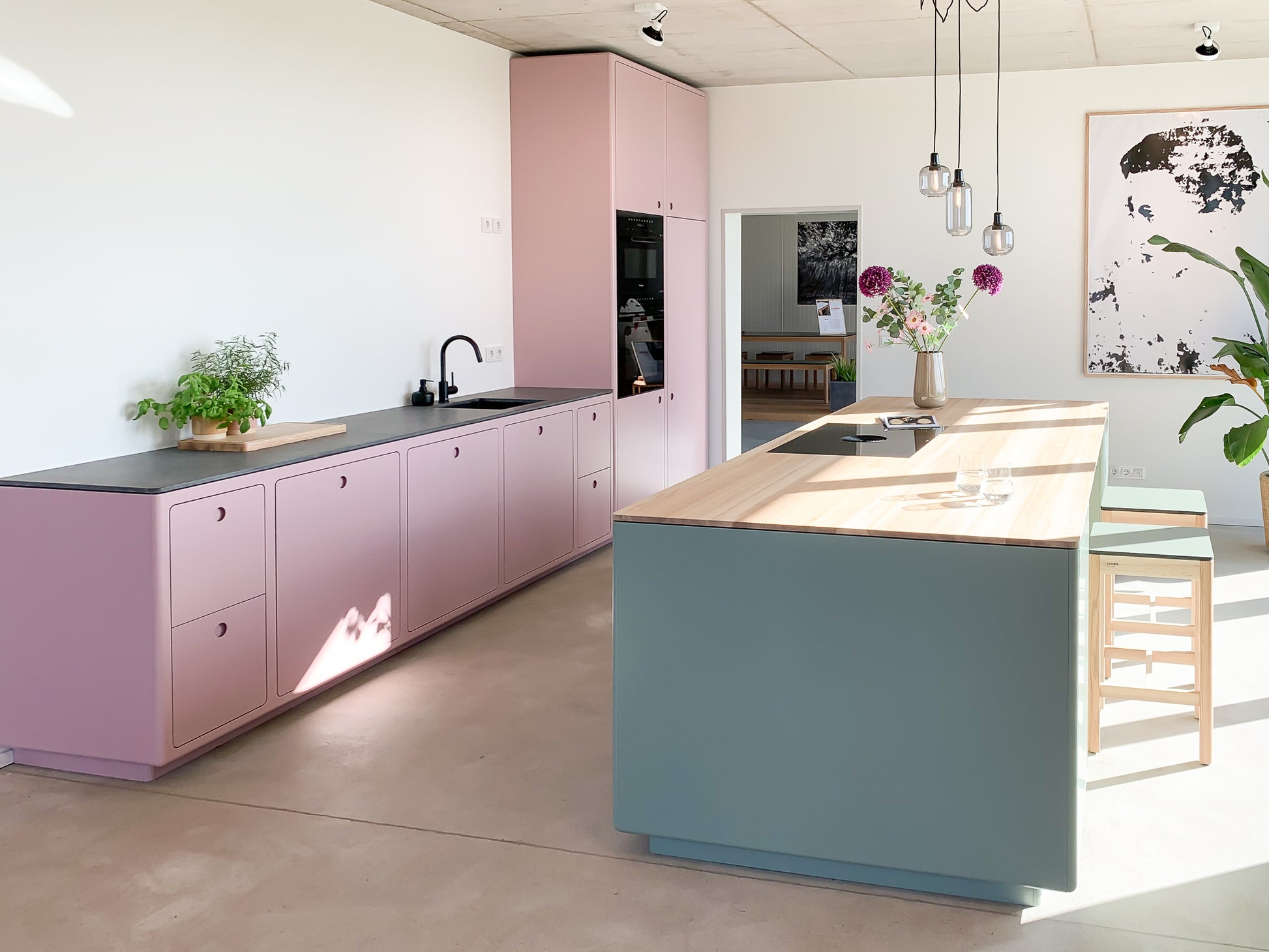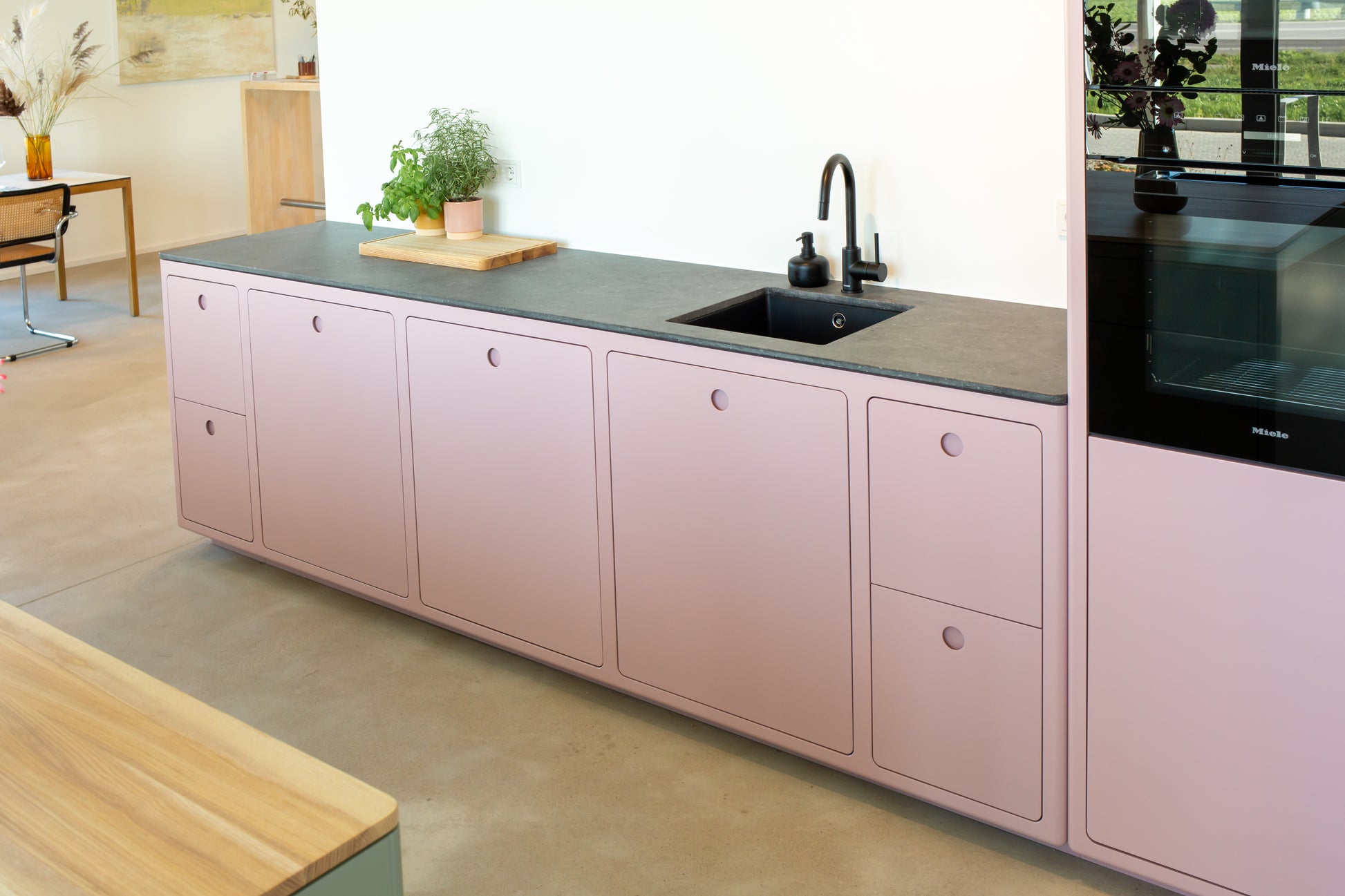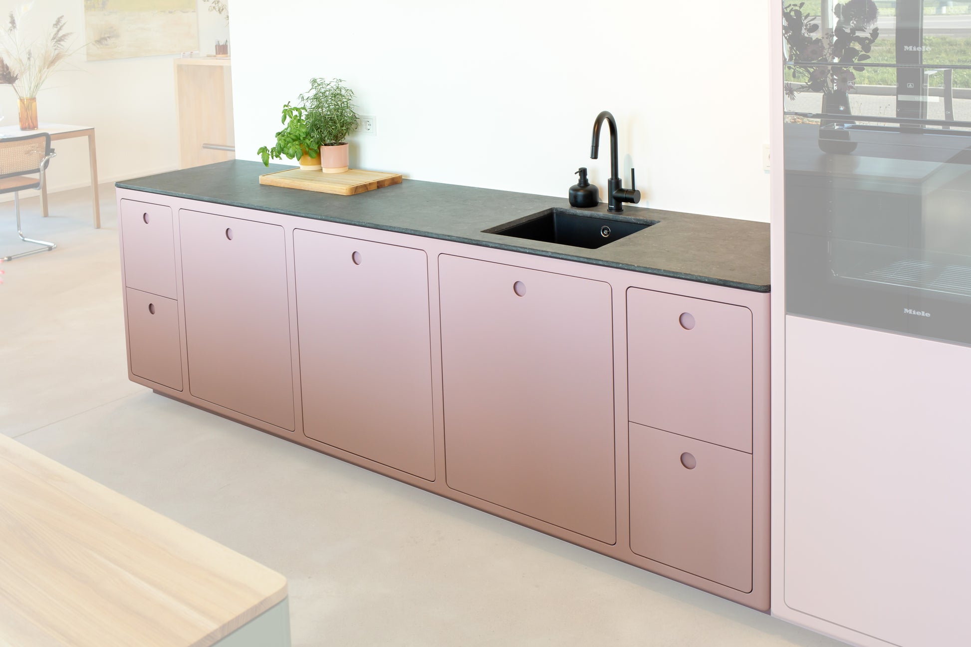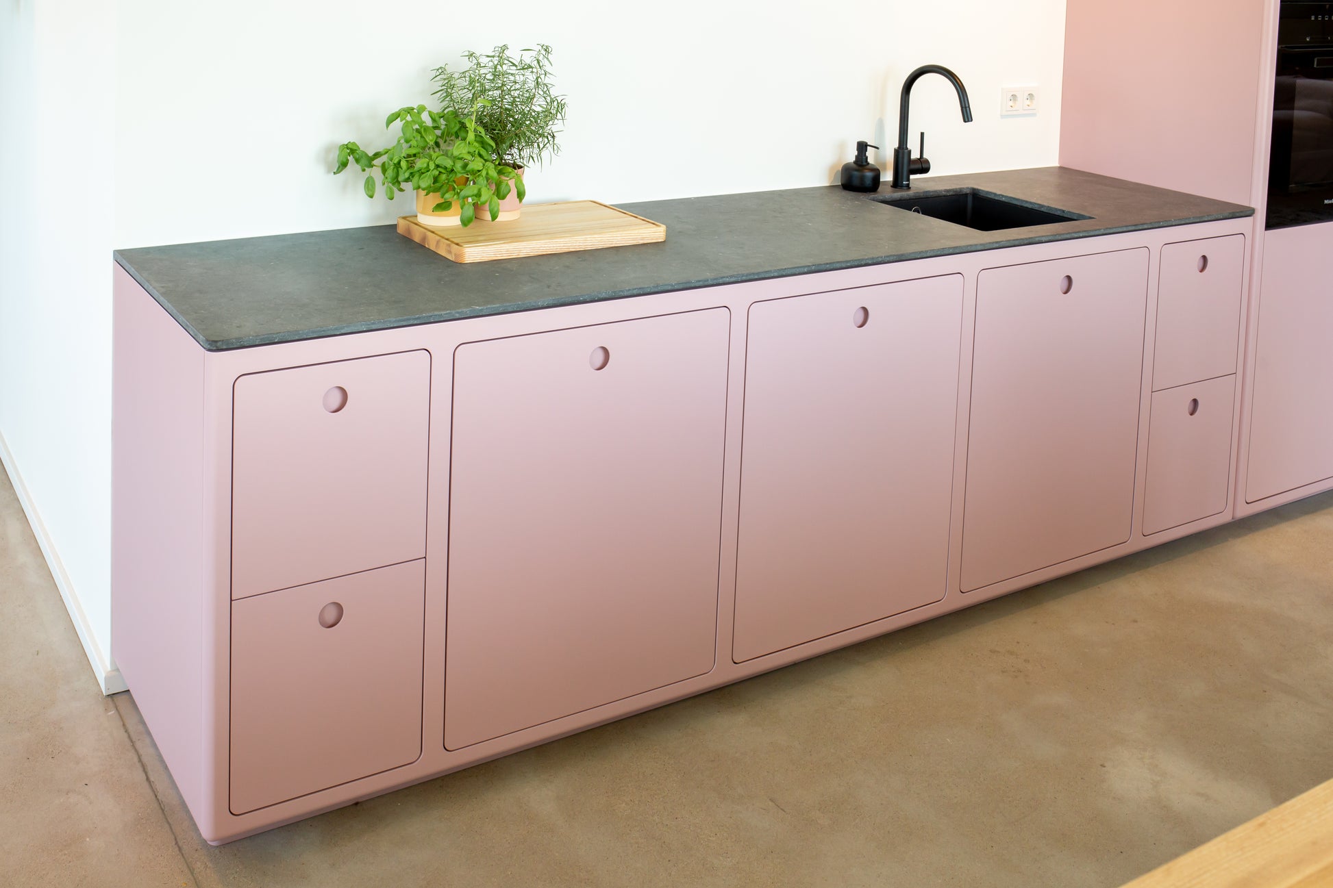 Bei der Materialauswahl setzten wir wo es geht auf Nachhaltigkeit. Das Material für die Korpusse besteht daher aus Cradle-to-Cradle zertifizierten Plattenwerkstoffen und bei der Lackierung verwenden wir umweltfreundlichen Wasserlack. Die Arbeitsfläche aus Blaustein ist ebenfalls regionaler Herkunft, sie stammt aus einem Steinbruch bei Aachen.