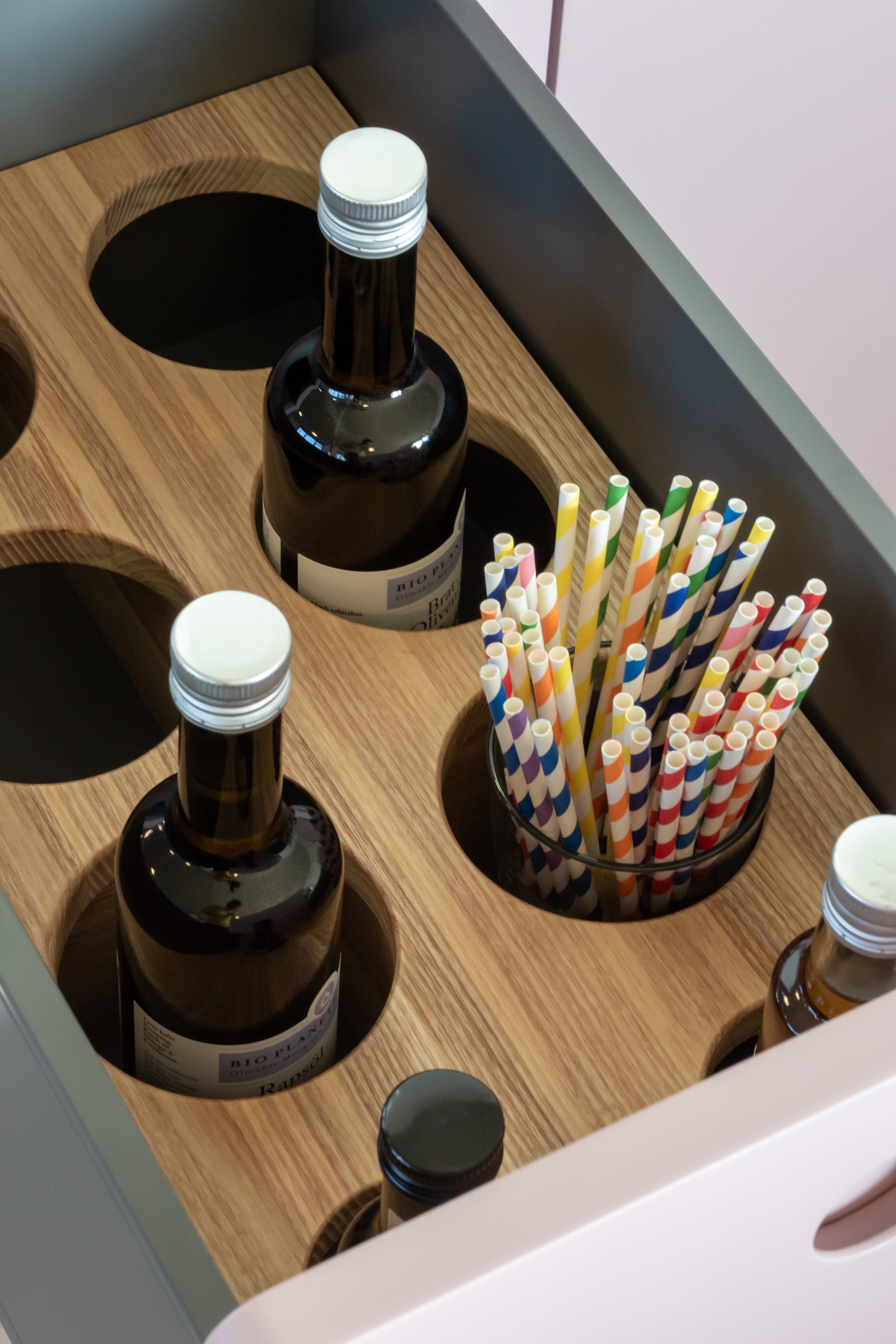 Alle Auszüge und Türen sind mit soft-close Technik ausgestattet und in unterschiedlichen Öffnungsvarianten erhältlich. Ebenso bieten wir individuelle Schubladeneinsätze aus Massivholz. Zum Beispiel für Besteck oder mit Flaschenhalter. Der Einbau und die Anordnung von Geräten wie Kühlschrank, Spülmaschine, Ofen, Mikrowelle oder Herd ist bei jeder FLOSS Küche individuell wählbar.