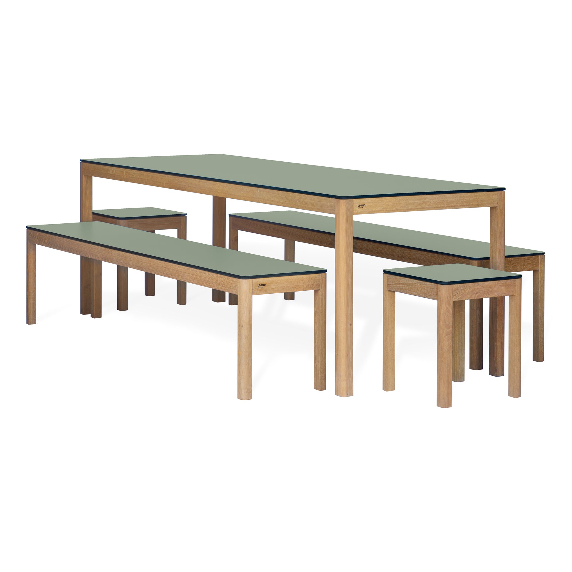 Das gesamte Set besteht aus einem Tisch, zwei Bänken und zwei Hockern der GRÄS Kollektion