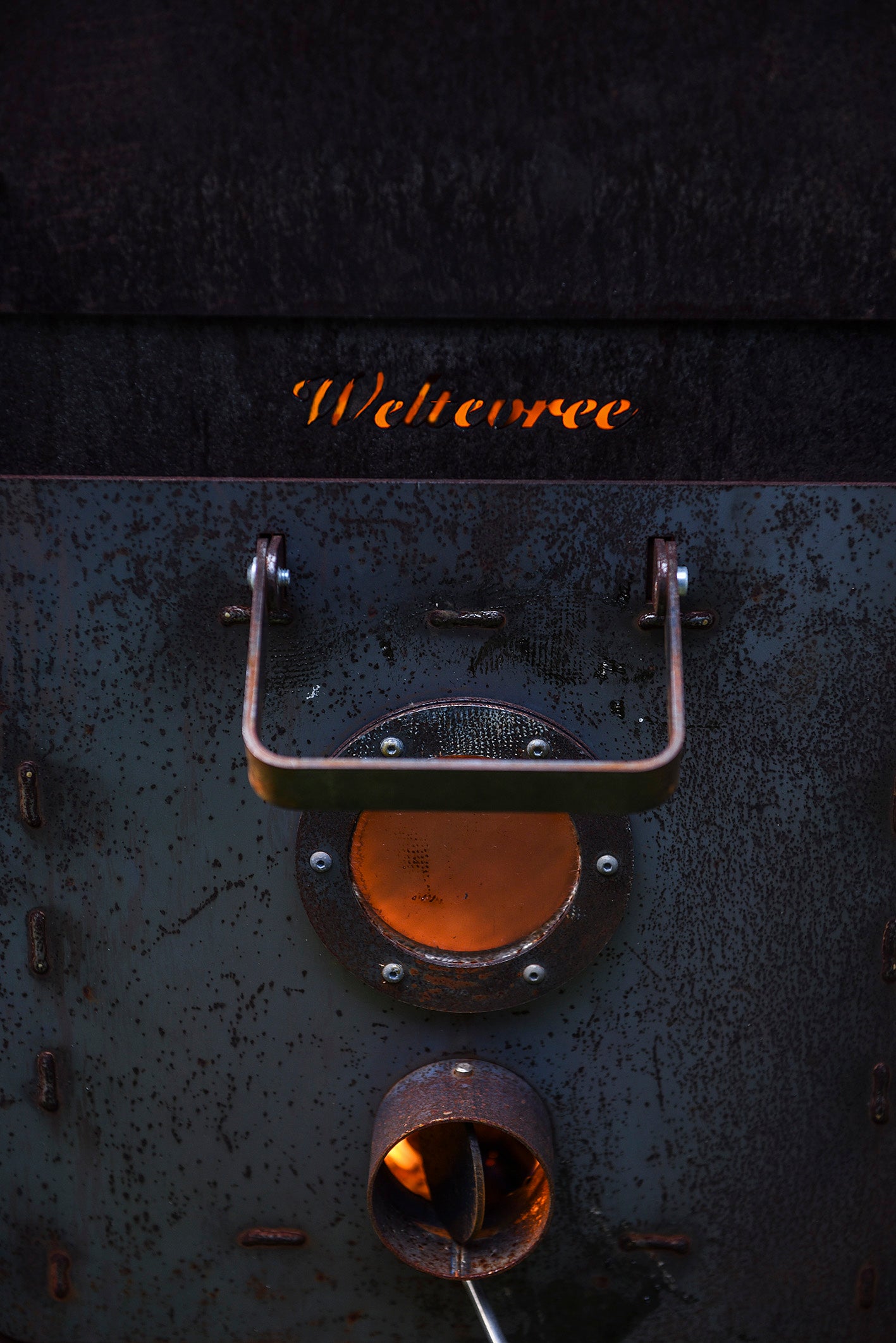 Ebenso wie der Ofen besteht die Klappe aus 3mm Cortenstahl. Die Klappe wird einfach mit zwei Haken unten eingehangen und im geöffneten Zustand auch gehalten. Der obere Griff verschließt und öffnet die Klappe intuitiv. Das kleine Fenster in der Mitte ermöglicht einen prüfenden Blick in die Brennkammer und das darunter eingelassene Ventil reguliert die Luftzufur.